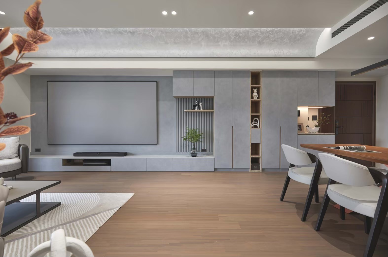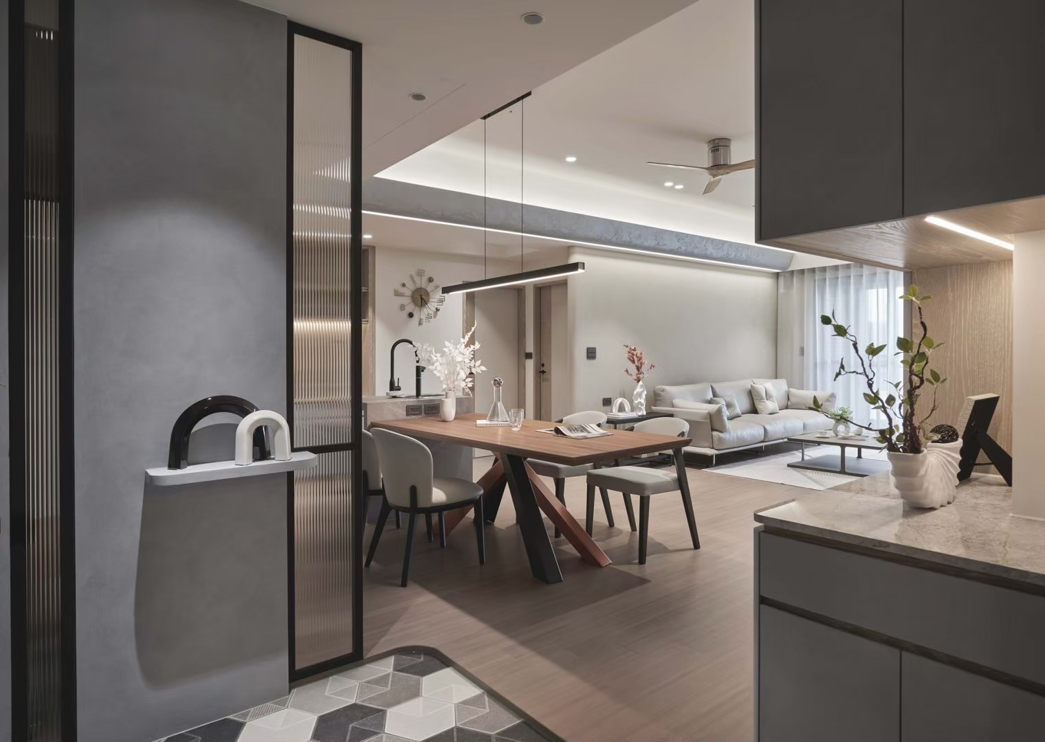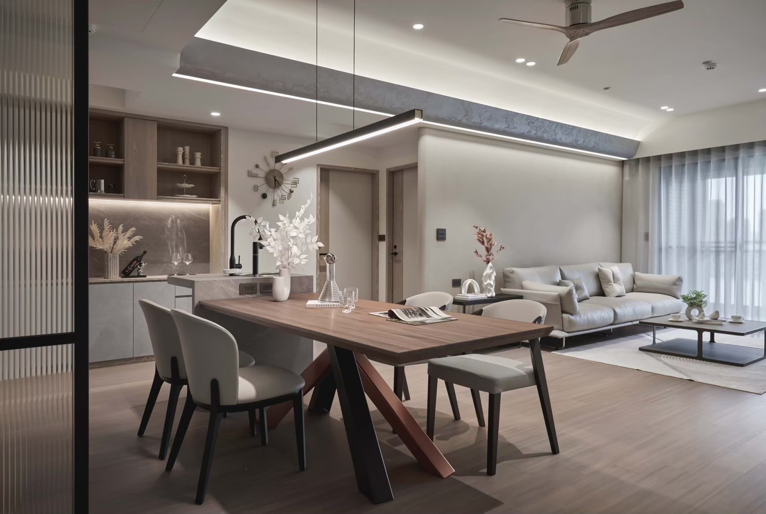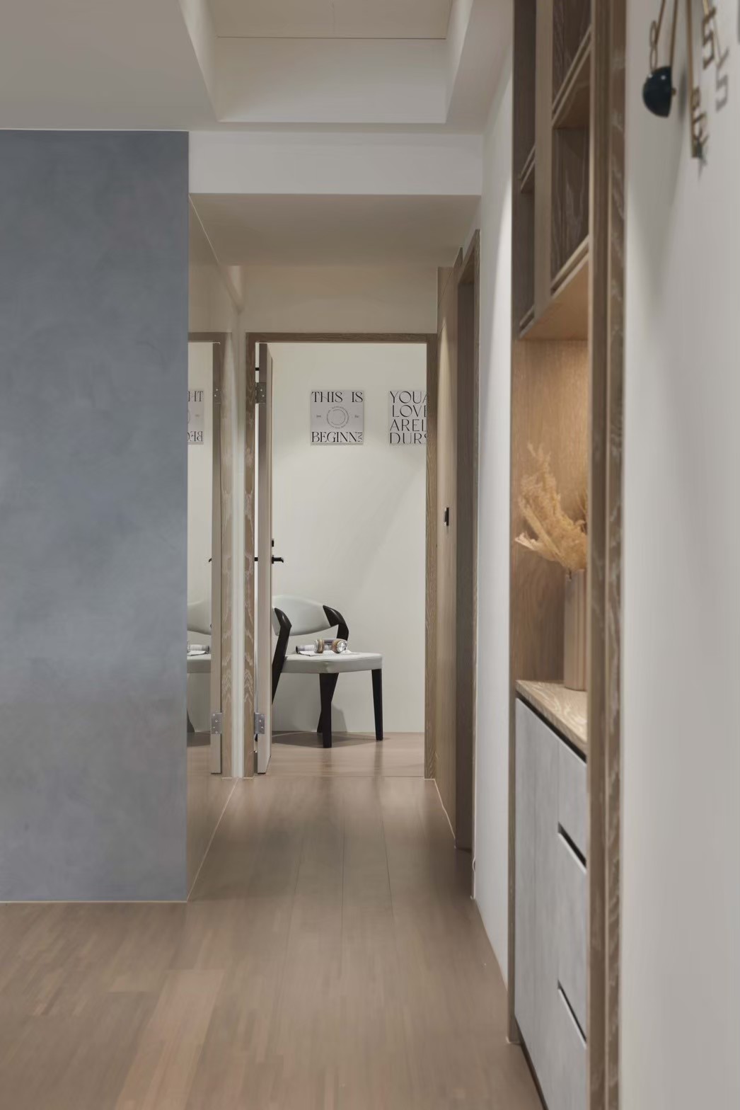 以北歐侘寂Japandi強調自然、紓壓的概念作為設計主張,以人文回憶來促成親子交流,巧妙地將視覺延伸、交錯、融合,回應居住者生活的動線及維繫完美的靈活度。無論材質或家具的選配上,除了協調上的美觀,也重視自然、環保、實用性的發展。 新成屋、60 坪室內空間,規劃為4房3衛2廳格局。材質、顏色、線條的安排上,以彰顯內斂雅緻的莫蘭迪色彩為主,跳脫繁複的元素,在材質的顏色上斟酌,給予空間一種放鬆、寧靜的包容意象,透過實木自然紋理的張力以及間接燈光的層次表情凝聚一種療癒的能量! 玄關以西班牙地磚的拼貼方式,打造落塵區;客、餐廳、廚房採開放方式規劃,動線機能開闊且充裕。全室海島型木地板鋪設,讓生活更添質樸溫馨…主臥設計以舒適溫馨規劃睡眠區,並設計收納與使用機能完備的更衣區,滿足女主人生活需求。私密空間整合畸零區域,動線流暢外,更規劃充裕收納機能。 整體設計,延續出主人生活的動態,並以最大使用坪效作為要件,褪去瑣碎的線條或顏色,跳脫材料、造型或機能等框架,回應家人之間的情感互動。以介面的關係延伸來轉換區域的變化,藉此減低不必要的空間線條,擘劃出機能、美感、尺度的平衡,揭露居住者個性,回應舒適、互動、開闊居家的悠閒時光。