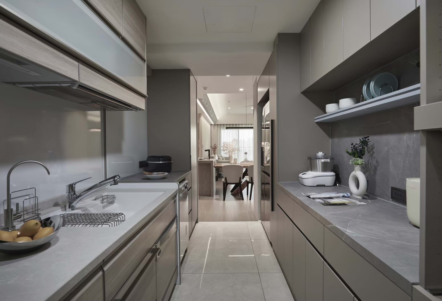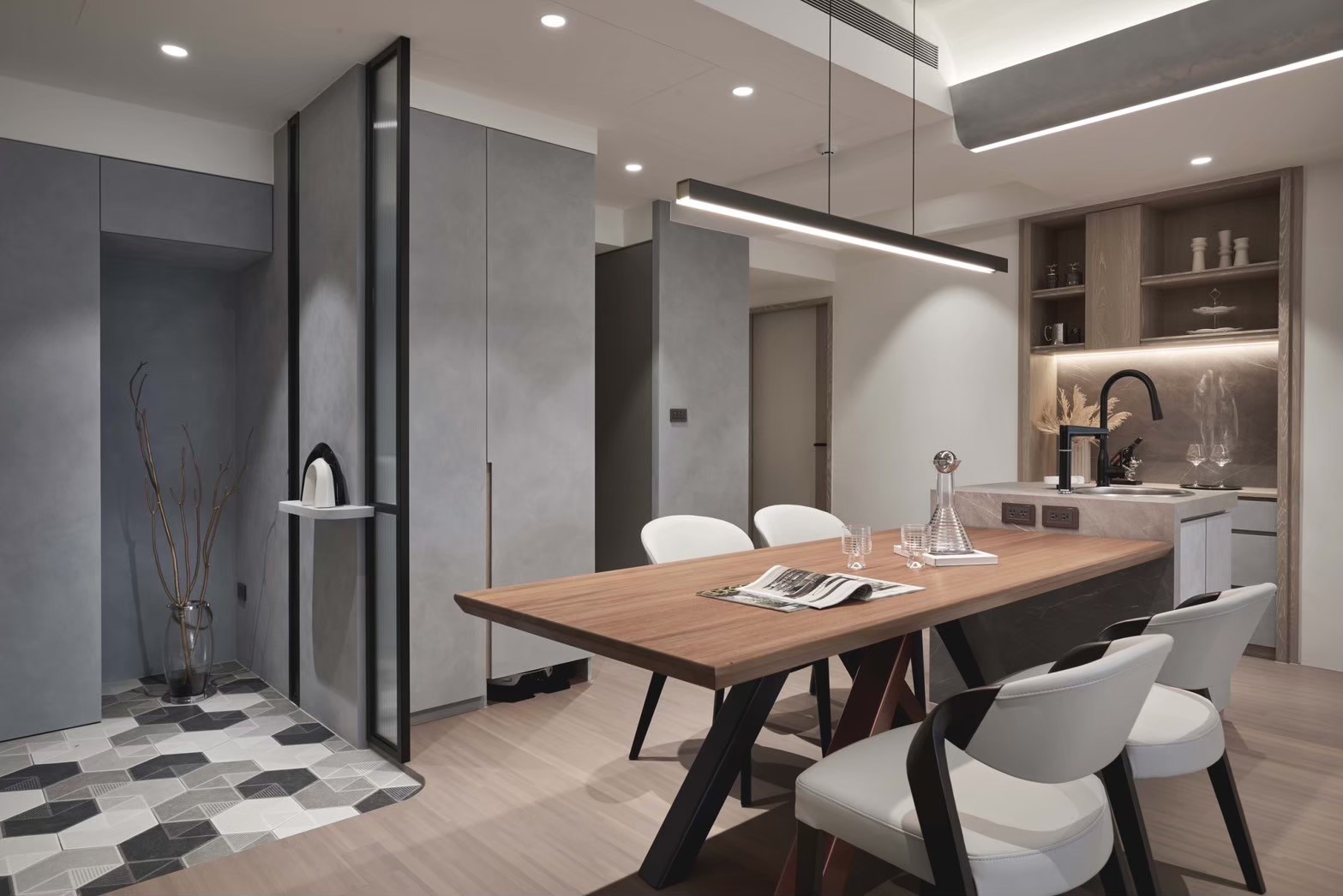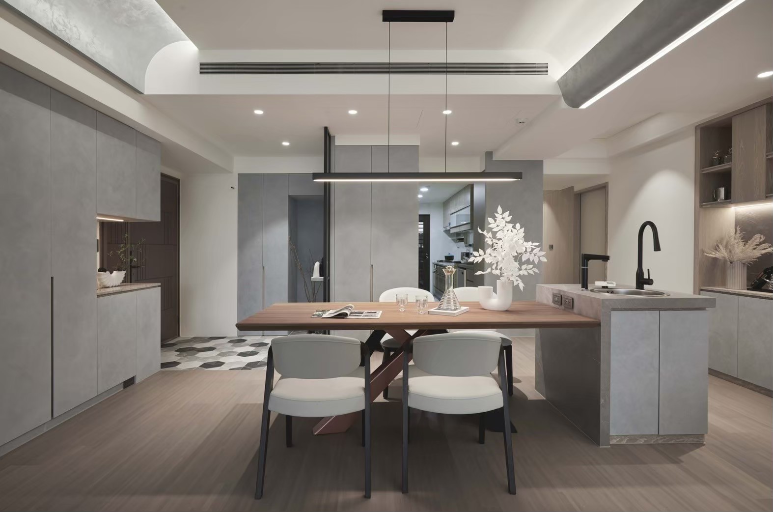 設計重心在於將空間舒適性發揮到最大,讓在生活起居裡的每一角度,隨時可以彼此連貫,不僅強化空間的延續性,也建構起整個平面配置最重要的核心意義。 開放區域的關係裡,餐桌聯袂開放式中島設計,連續廚房動線,機能充裕,滿足親友來訪、餐敘日常,成為整個空間設計的重心所在。