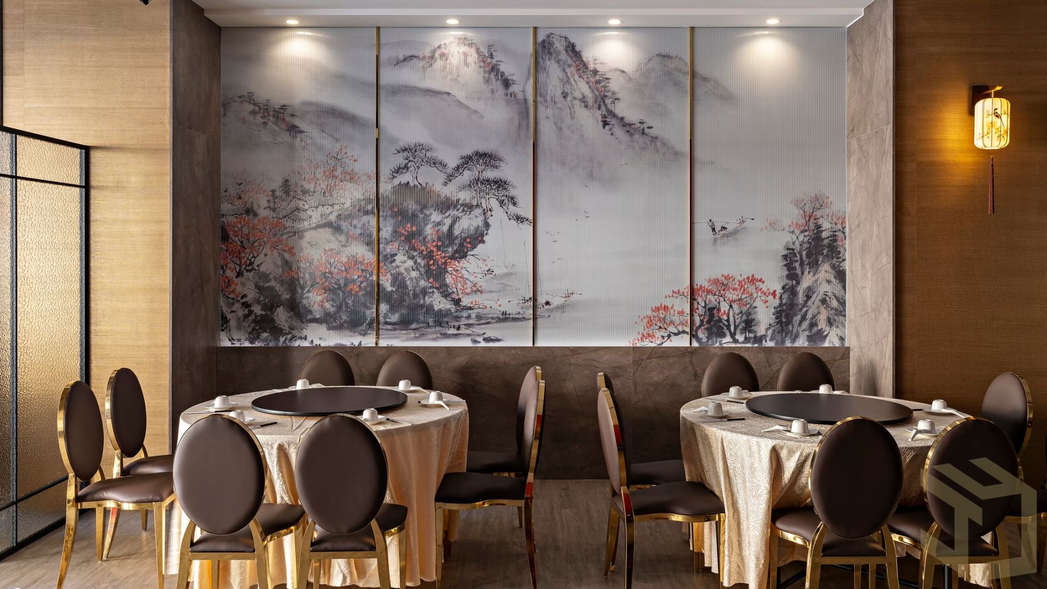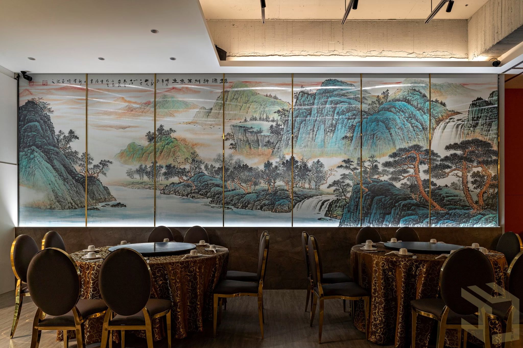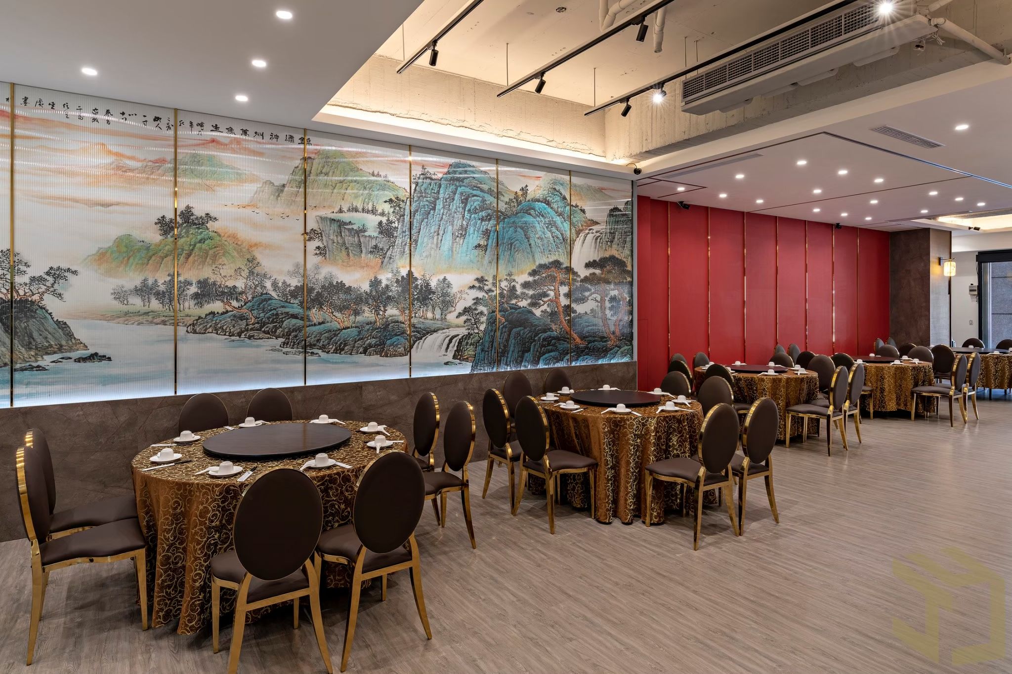 50坪的餐廳空間設計,藉由輕東方風格的雅致脫俗、灑脫豪邁,轉繹開敞大器的空間印象。 “中國紅”是東方悠長文化圖騰和精神皈依,寓意喜慶、熱鬧與祥和。於此將“中國紅”作為中式餐廳設計規劃的主色調。開放式的用餐環境,藉由間接燈光設計、東方潑墨畫作、特色標語,復古燈籠,作為各區座位的中介,隱匿卻不張揚,靜謐而優雅的線面主張,挹注東方的卓絕風雅,在古典與現代之間,讓您一邊享用美食,一邊沉浸在中式文化底蘊裡…