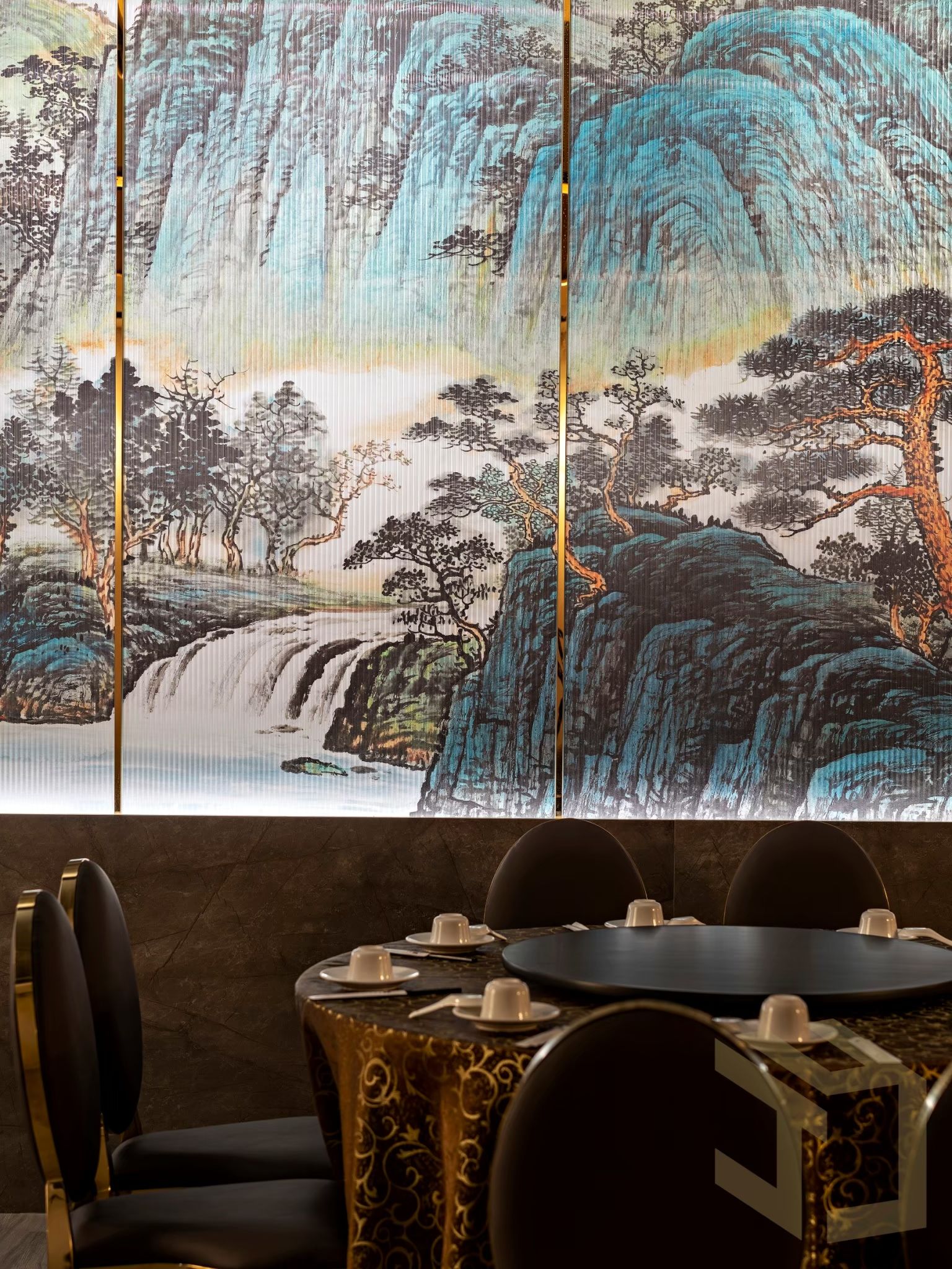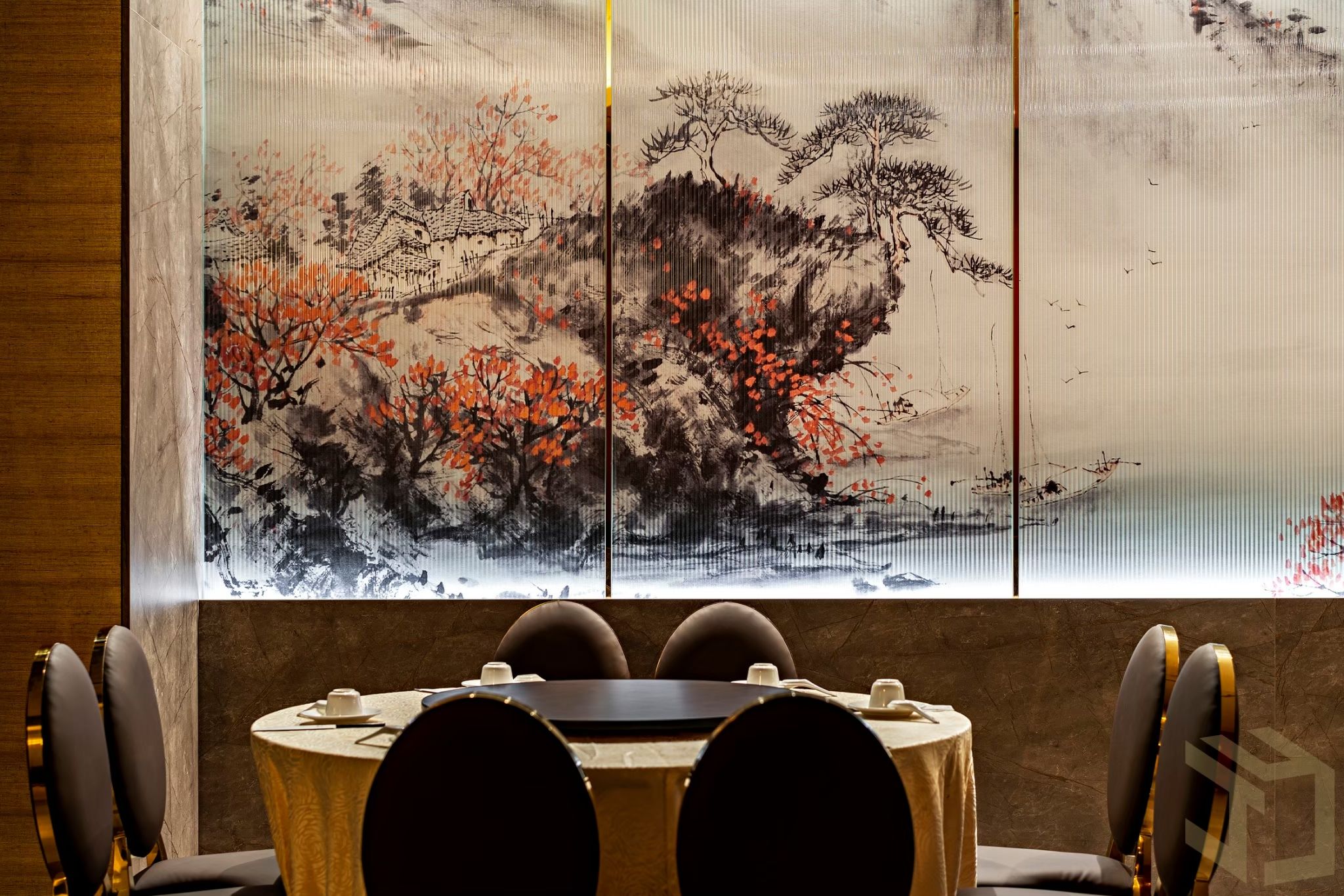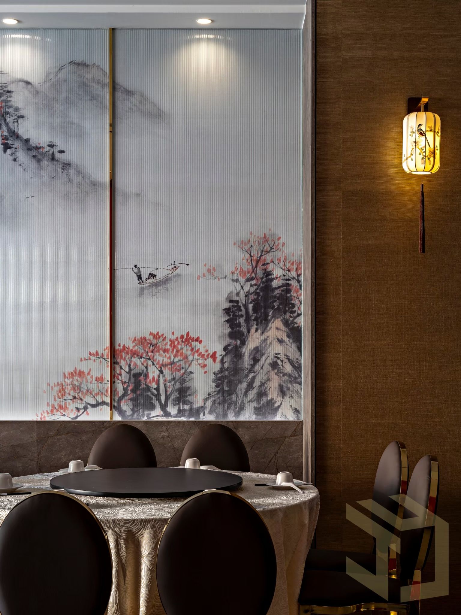 50坪的餐廳空間設計,藉由輕東方風格的雅致脫俗、灑脫豪邁,轉繹開敞大器的空間印象。 “中國紅”是東方悠長文化圖騰和精神皈依,寓意喜慶、熱鬧與祥和。於此將“中國紅”作為中式餐廳設計規劃的主色調。開放式的用餐環境,藉由間接燈光設計、東方潑墨畫作、特色標語,復古燈籠,作為各區座位的中介,隱匿卻不張揚,靜謐而優雅的線面主張,挹注東方的卓絕風雅,在古典與現代之間,讓您一邊享用美食,一邊沉浸在中式文化底蘊裡…