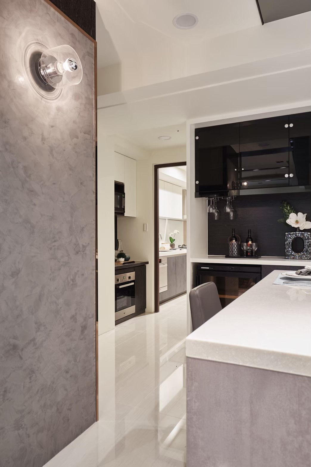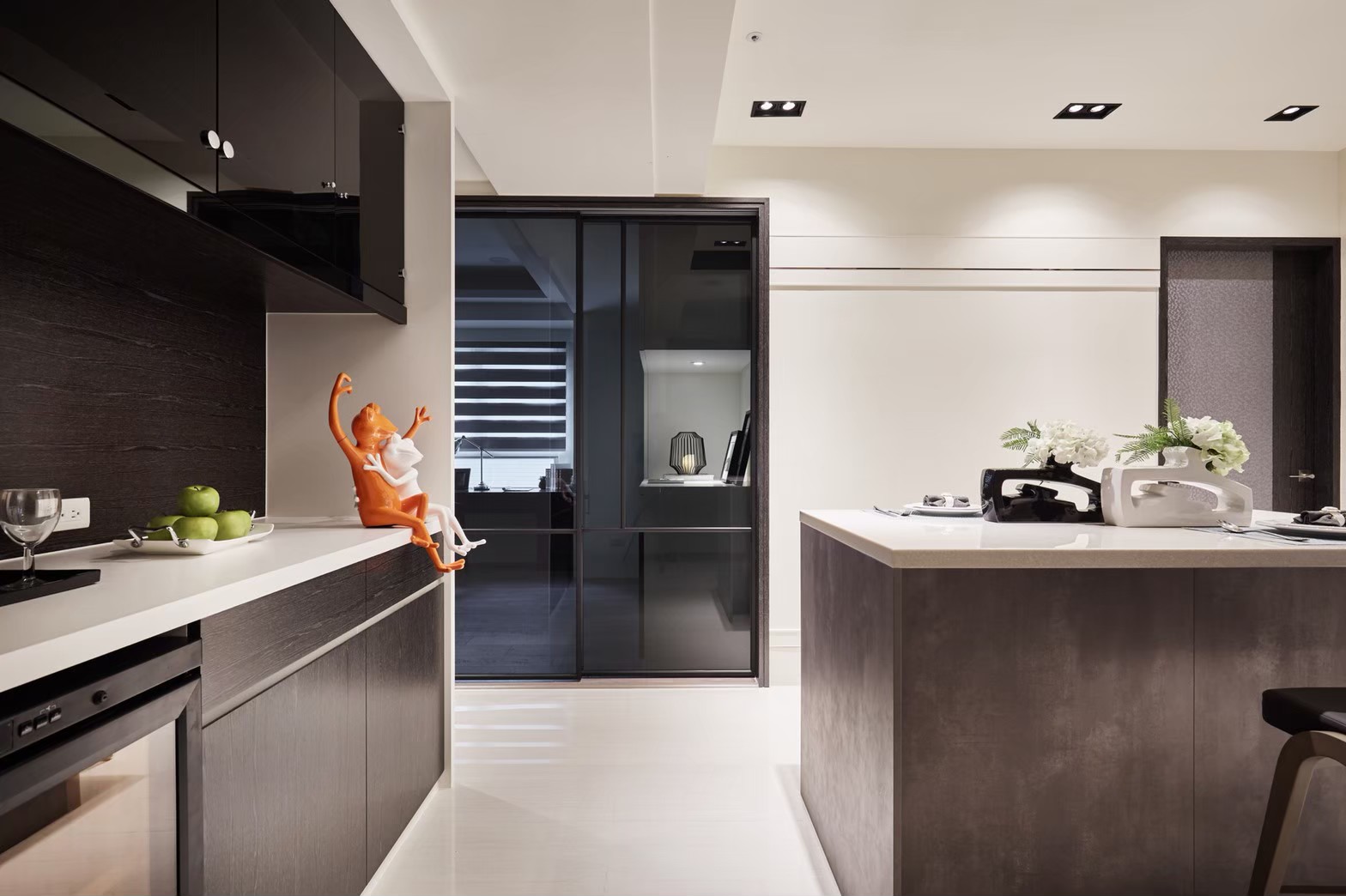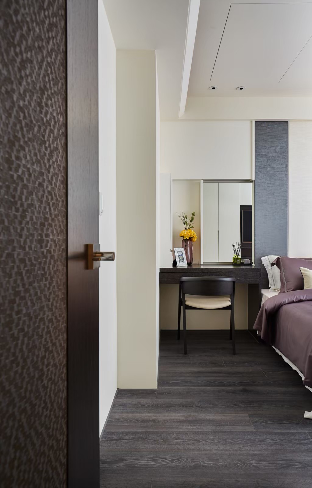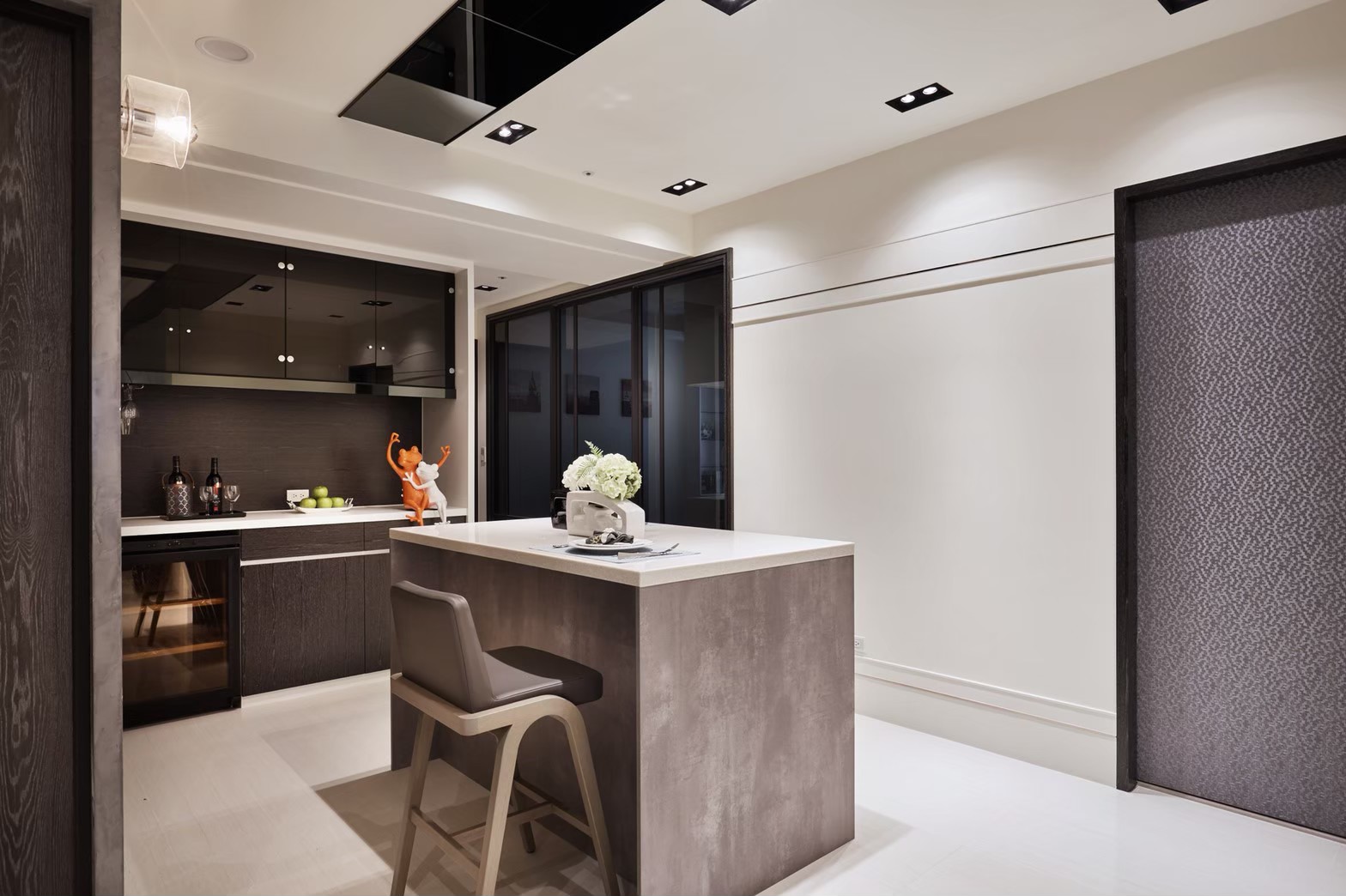 1.金圓室內設計駱中揚設計師在玄關區以不同材質作表現,收納線條俐落淡化量體存在感,深色木紋烘托插花淺檯凸顯端景美學。 2.公領域分化為客廳區及多功能區,窗邊位置以木地板墊高成為擺放鋼琴專區,並運用修飾梁柱的邊角畸零空間,規劃收納及精品展示櫃。 3.天花板運用虛實交替手法修飾橫梁,鏡射材質詮釋了琴鍵般的意象,也讓梁位消失無影。 4.駱中揚設計師以特殊漆搭配造型壁燈,為進入餐廚區前設下轉換符碼,餐廳採開放式中島造型設計,搭配旁側整合餐具電器櫃,讓空間散發時尚氛圍。 5.書房內墊高木質地坪,大窗邊設置書桌,旁側沿牆設計收納與展示複合櫃,燈光安排讓收藏展示更亮眼。 6.次主臥床頭繃布局部鑲飾鍍鈦,質感內斂高雅;窗邊設計木質臥榻,收納與休憩兼備,床尾黑白色收編衣櫃、視聽機能,現代感十足。 7.主臥床頭主牆採深色木質圍塑半腰,腰上選用紋理細緻微閃光澤繃布,天花精心造型深淺層次,構築大方沉穩臥眠風情。