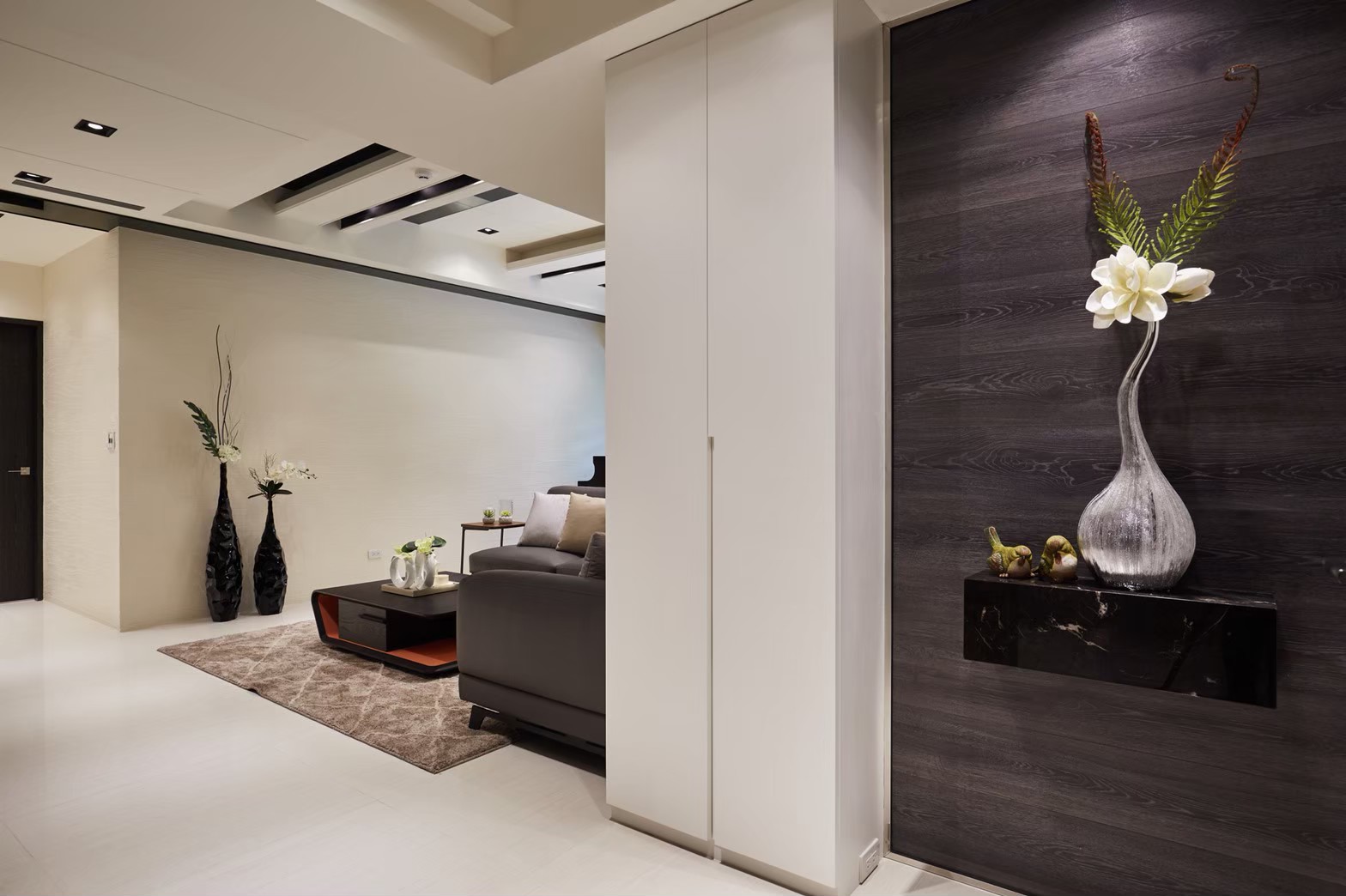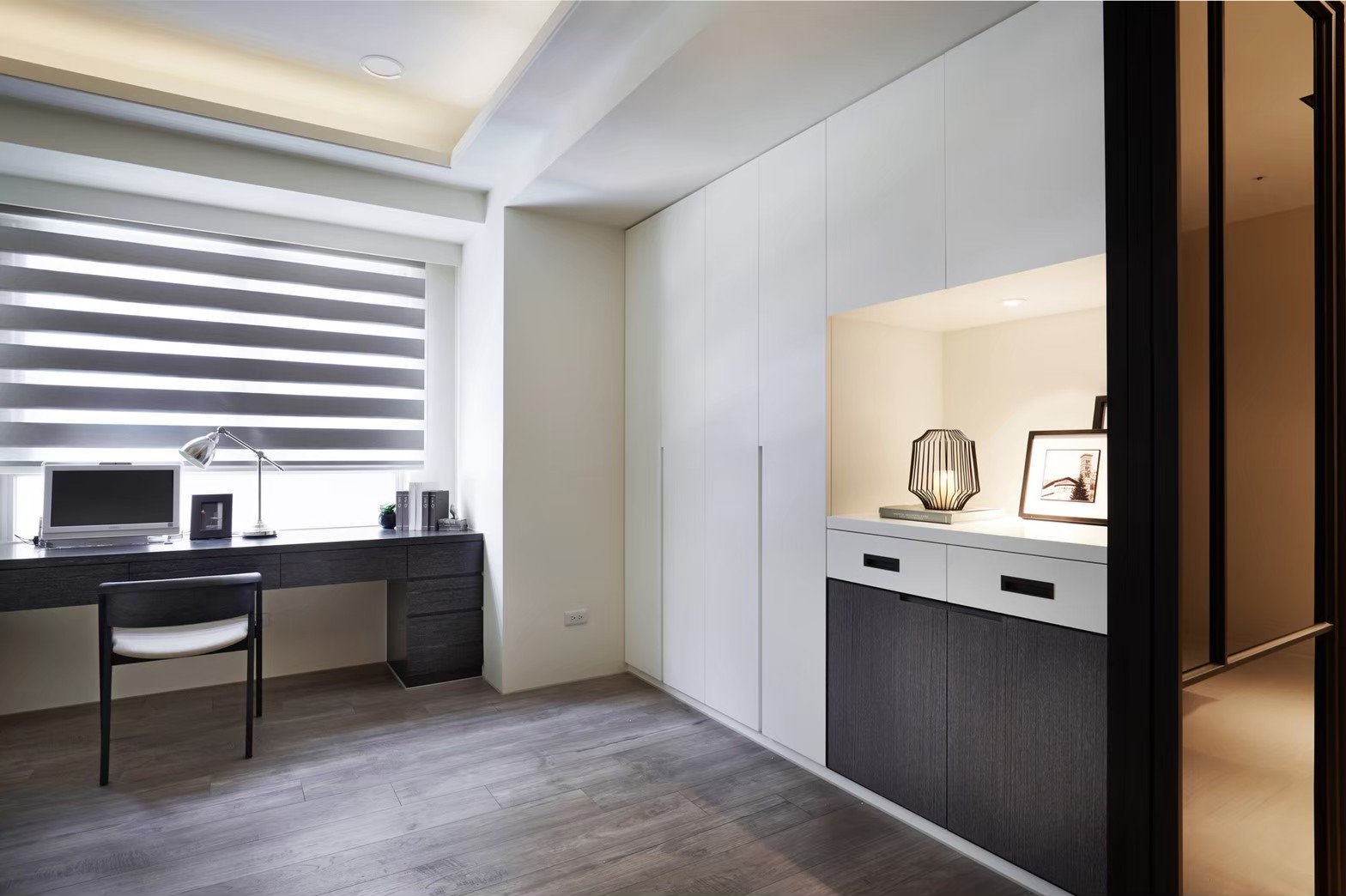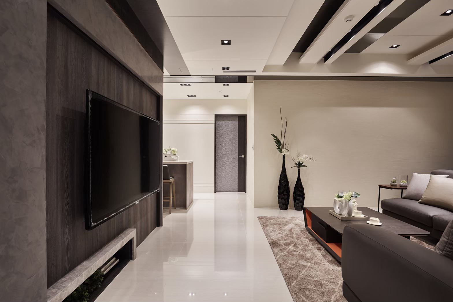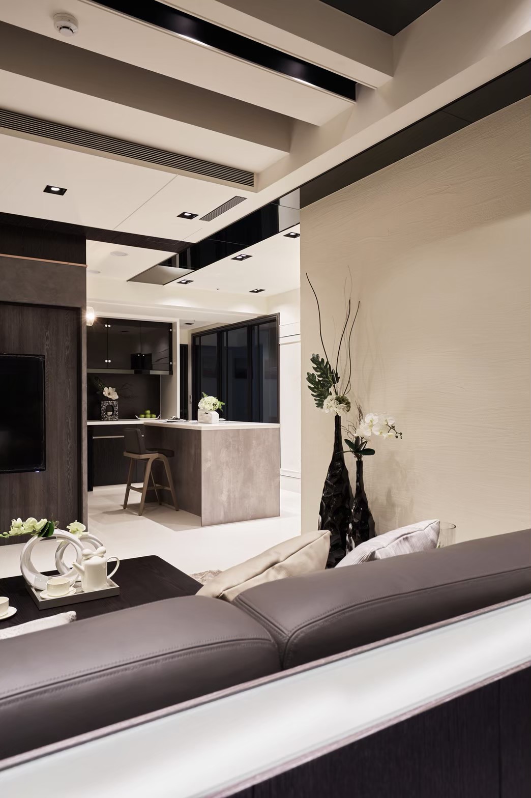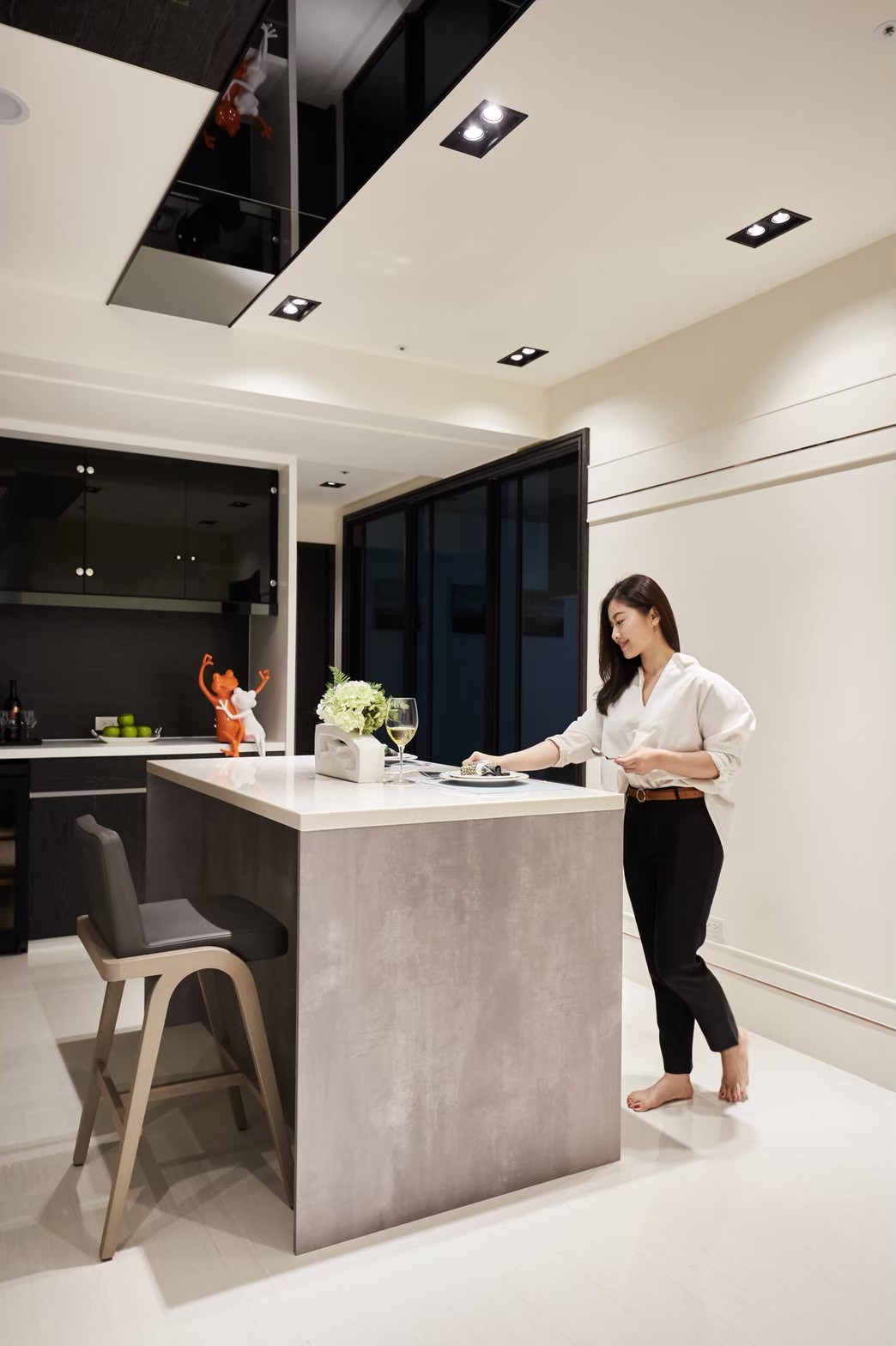 1.金圓室內設計駱中揚設計師在玄關區以不同材質作表現,收納線條俐落淡化量體存在感,深色木紋烘托插花淺檯凸顯端景美學。 2.公領域分化為客廳區及多功能區,窗邊位置以木地板墊高成為擺放鋼琴專區,並運用修飾梁柱的邊角畸零空間,規劃收納及精品展示櫃。 3.天花板運用虛實交替手法修飾橫梁,鏡射材質詮釋了琴鍵般的意象,也讓梁位消失無影。 4.駱中揚設計師以特殊漆搭配造型壁燈,為進入餐廚區前設下轉換符碼,餐廳採開放式中島造型設計,搭配旁側整合餐具電器櫃,讓空間散發時尚氛圍。 5.書房內墊高木質地坪,大窗邊設置書桌,旁側沿牆設計收納與展示複合櫃,燈光安排讓收藏展示更亮眼。 6.次主臥床頭繃布局部鑲飾鍍鈦,質感內斂高雅;窗邊設計木質臥榻,收納與休憩兼備,床尾黑白色收編衣櫃、視聽機能,現代感十足。 7.主臥床頭主牆採深色木質圍塑半腰,腰上選用紋理細緻微閃光澤繃布,天花精心造型深淺層次,構築大方沉穩臥眠風情。