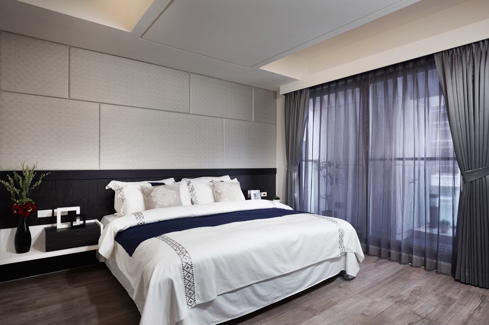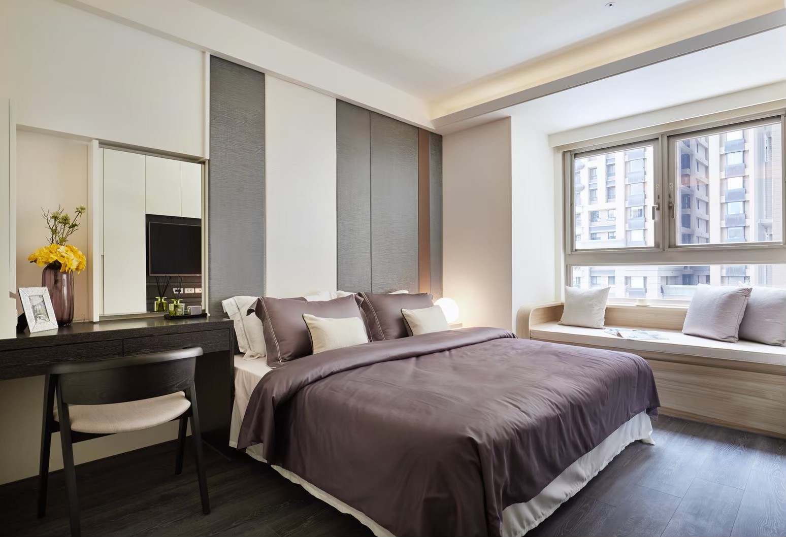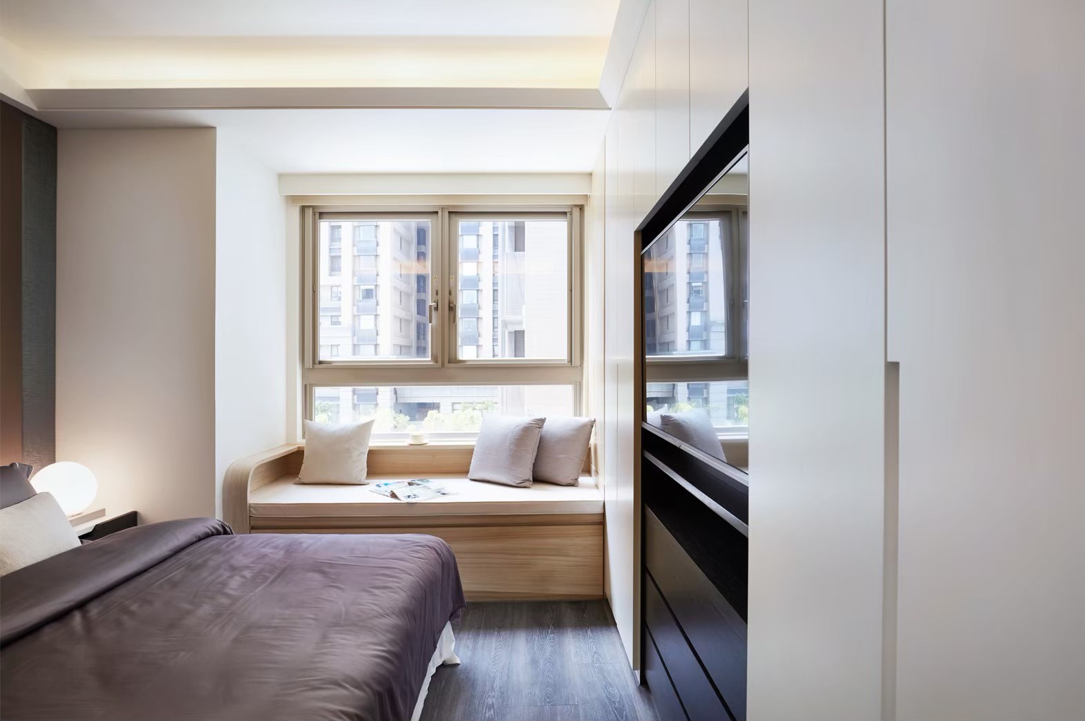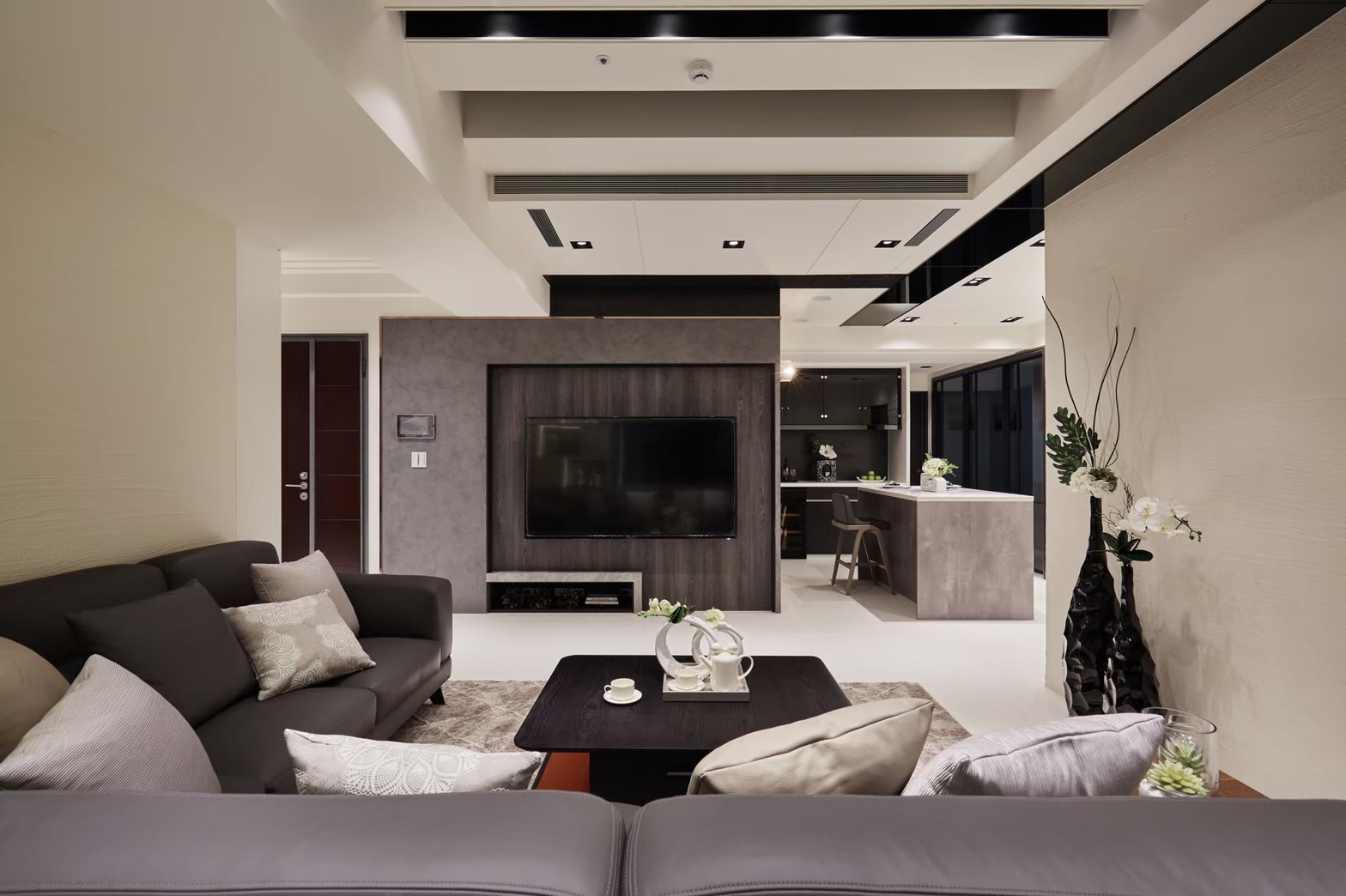 1.金圓室內設計駱中揚設計師在玄關區以不同材質作表現,收納線條俐落淡化量體存在感,深色木紋烘托插花淺檯凸顯端景美學。 2.公領域分化為客廳區及多功能區,窗邊位置以木地板墊高成為擺放鋼琴專區,並運用修飾梁柱的邊角畸零空間,規劃收納及精品展示櫃。 3.天花板運用虛實交替手法修飾橫梁,鏡射材質詮釋了琴鍵般的意象,也讓梁位消失無影。 4.駱中揚設計師以特殊漆搭配造型壁燈,為進入餐廚區前設下轉換符碼,餐廳採開放式中島造型設計,搭配旁側整合餐具電器櫃,讓空間散發時尚氛圍。 5.書房內墊高木質地坪,大窗邊設置書桌,旁側沿牆設計收納與展示複合櫃,燈光安排讓收藏展示更亮眼。 6.次主臥床頭繃布局部鑲飾鍍鈦,質感內斂高雅;窗邊設計木質臥榻,收納與休憩兼備,床尾黑白色收編衣櫃、視聽機能,現代感十足。 7.主臥床頭主牆採深色木質圍塑半腰,腰上選用紋理細緻微閃光澤繃布,天花精心造型深淺層次,構築大方沉穩臥眠風情。