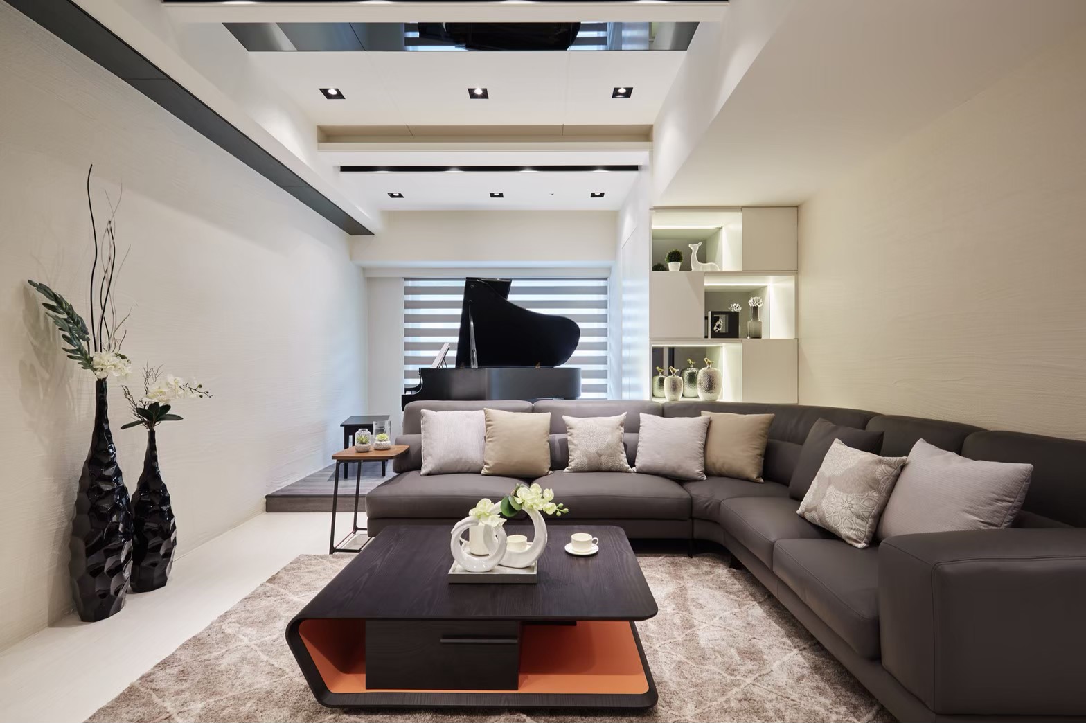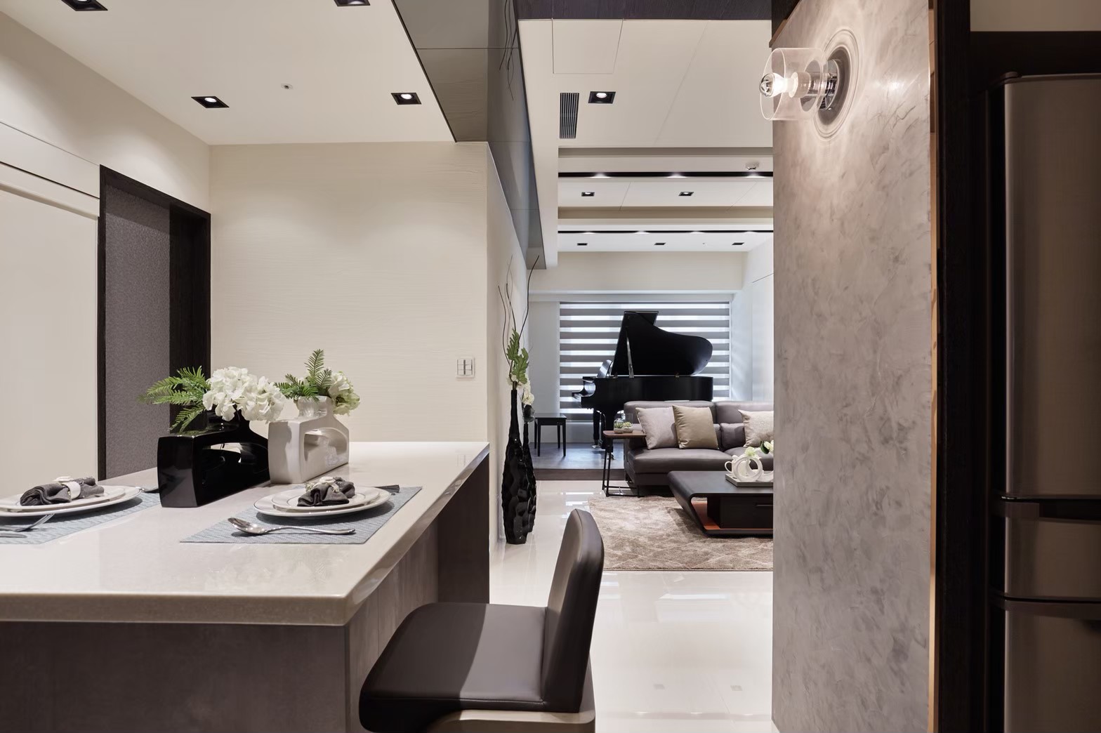 1.金圓室內設計將被大梁柱所侷限的公領域做適切的分配,近窗處地坪不足以擺放大沙發的區塊,剛好規劃為鋼琴區,開放式設計不影響客廳的自然光及敞朗感,兩場域依偎的設計,讓客廳能充分享受優美環繞的琴音。 2.重新配置的場域,在天花板部分受橫梁干擾,駱中揚設計師採用虛實交替手法,機能埋設隱藏其中,以鏡面材質黑白錯色表現交替層次,呼應黑白琴鍵的空間主題。